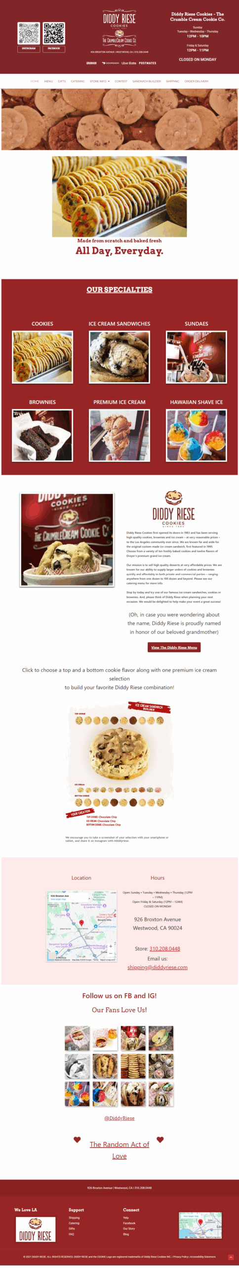 Diddy Riese Cookies first opened its doors in 1983 and has been serving high quality cookies, brownies and ice cream – at very reasonable prices – to the Los Angeles community ever since. We are known far and wide for the original custom-made ice cream sandwich, first featured in 1995. Choose from a variety of ten freshly baked cookies and twelve flavors of Dreyer’s premium grand ice cream.